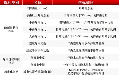 綜合考慮降雨量、降雨過程、城市化影響等因素,課題組構建了一套多維度的降雨特征指標體系,在武漢及其他長江中下游地區(qū)平原型城市中具有較好的適用性。