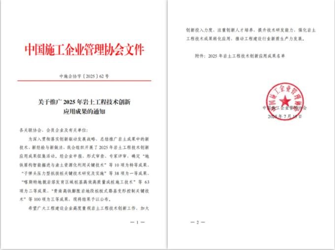 ? ? 近日,中國施工企業(yè)管理協(xié)會(huì)2025年巖土工程技術(shù)創(chuàng)新應(yīng)用成果結(jié)果正式揭曉。經(jīng)過企業(yè)申報(bào)、形式審查、專家評(píng)審等多個(gè)環(huán)節(jié)遴選,武漢市政院巖土博士創(chuàng)新工作室申報(bào)的“深厚富水圓礫層基坑地下水控制特種技術(shù)”、“敏感環(huán)境地鐵盾構(gòu)隧道穿越極硬巖特種技術(shù)”等2項(xiàng)技術(shù)創(chuàng)新性顯著,獲評(píng)為三等成果。