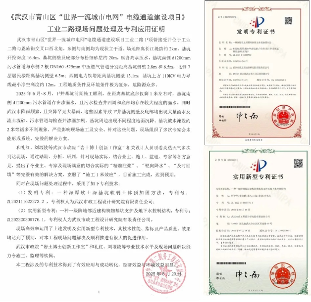 發(fā)明專利“一種深厚軟土深基坑軟弱土體預(yù)加固方法”(專利號(hào):ZL202111022273.2)與實(shí)用新型專利“一種一級(jí)階地鄰近建構(gòu)筑物基坑支護(hù)及地下水控制結(jié)構(gòu)”(專利號(hào):ZL202220309776.1),在武漢市青山區(qū)“世界一流城市電網(wǎng)”電纜通道建設(shè)項(xiàng)目——工業(yè)二路現(xiàn)場(chǎng)問題處理中實(shí)現(xiàn)了高效應(yīng)用。兩項(xiàng)專利的技術(shù)性能、實(shí)施效果及產(chǎn)品質(zhì)量均達(dá)到預(yù)期目標(biāo),成功完成了技術(shù)轉(zhuǎn)化,展現(xiàn)出良好的經(jīng)濟(jì)效益與環(huán)境效益。