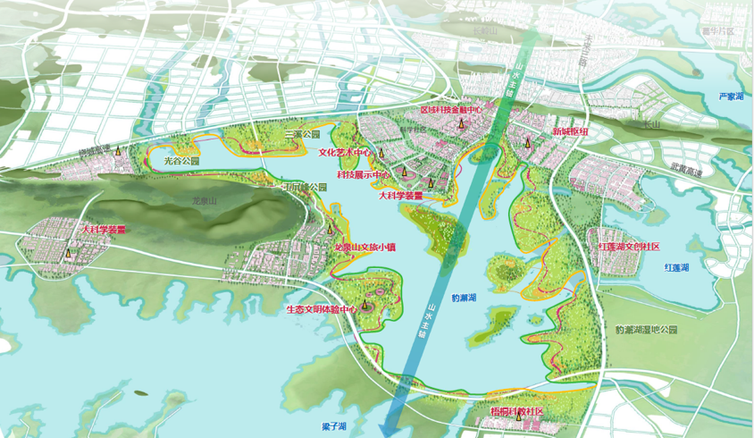 ? ? 豹澥湖位于武漢新城的山水景觀主軸,是武漢新城構(gòu)建“看山望水、疏朗通透”景觀視廊體系的重要節(jié)點(diǎn),也是武鄂黃黃核心區(qū)南部湖區(qū)生態(tài)空間的重要組成部分,是大江大湖群山富集之地,流域的系統(tǒng)化治理也是推動(dòng)武鄂黃黃一體化建設(shè)的關(guān)鍵性實(shí)踐。以科學(xué)島為核心的環(huán)豹澥湖科創(chuàng)圈已初具規(guī)模,豹澥湖流域?qū)⑹俏錆h新城區(qū)域內(nèi)未來最具發(fā)展?jié)摿Φ暮诵膮^(qū)。