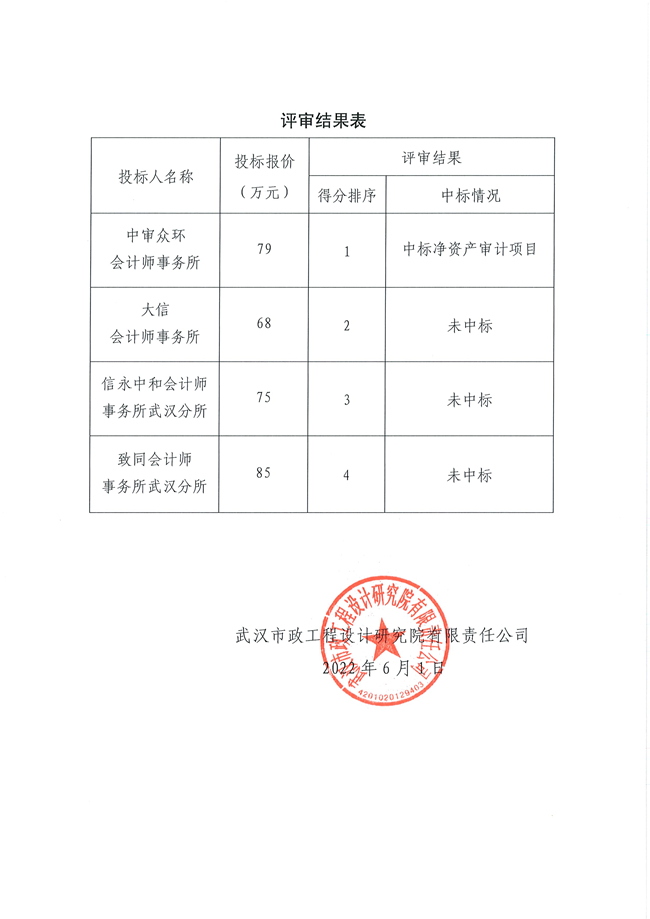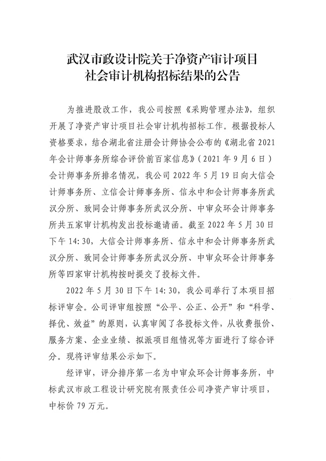 武漢市政設(shè)計院關(guān)于凈資產(chǎn)審計項目社會審計機構(gòu)招標結(jié)果的公告