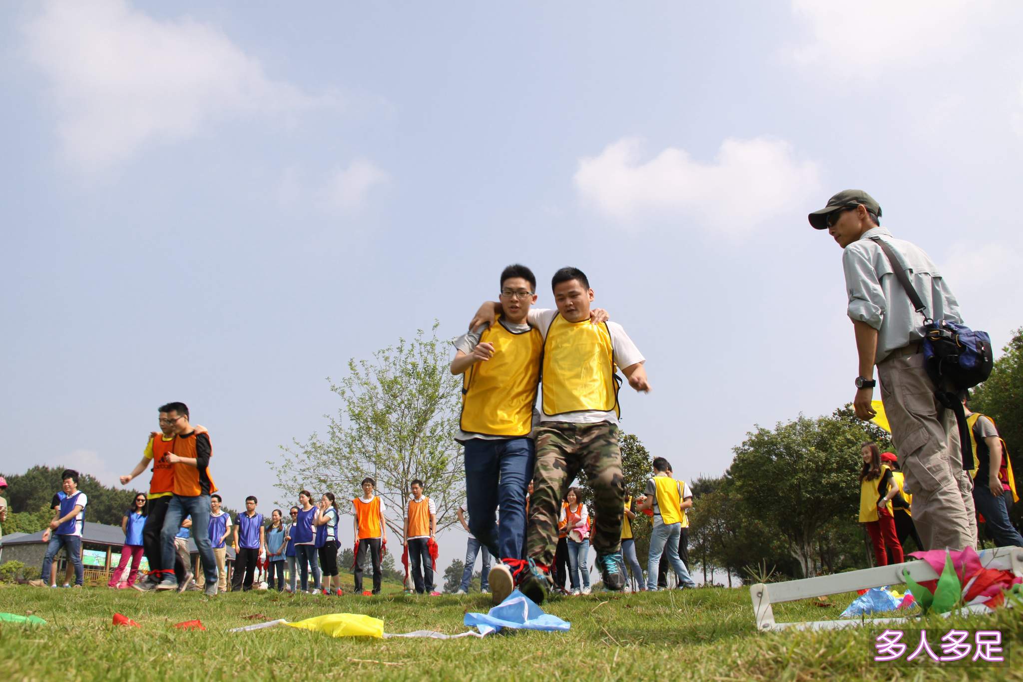 ??? 在上午進行的場地項目中,青年員工在經(jīng)過簡短的熱身后被分成了三支隊伍,在確定各自的隊伍名稱、隊旗、口號、隊歌后,活動項目正式開始。在第一項“多人多足”的項目中,每支隊伍的隊員們通力合作,默契配合,均以較好的成績完成了活動內(nèi)容。