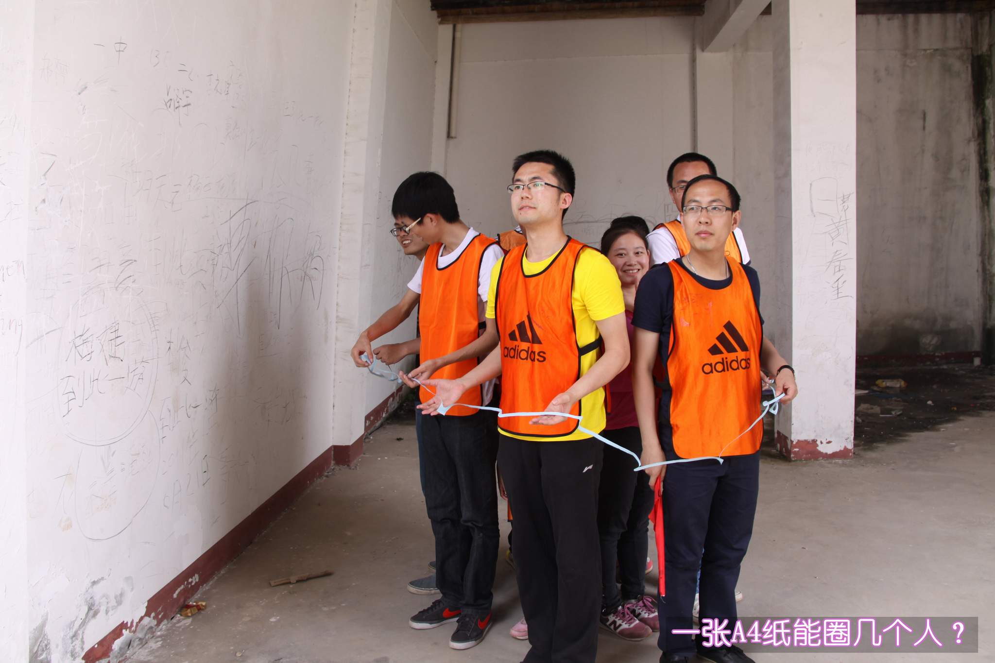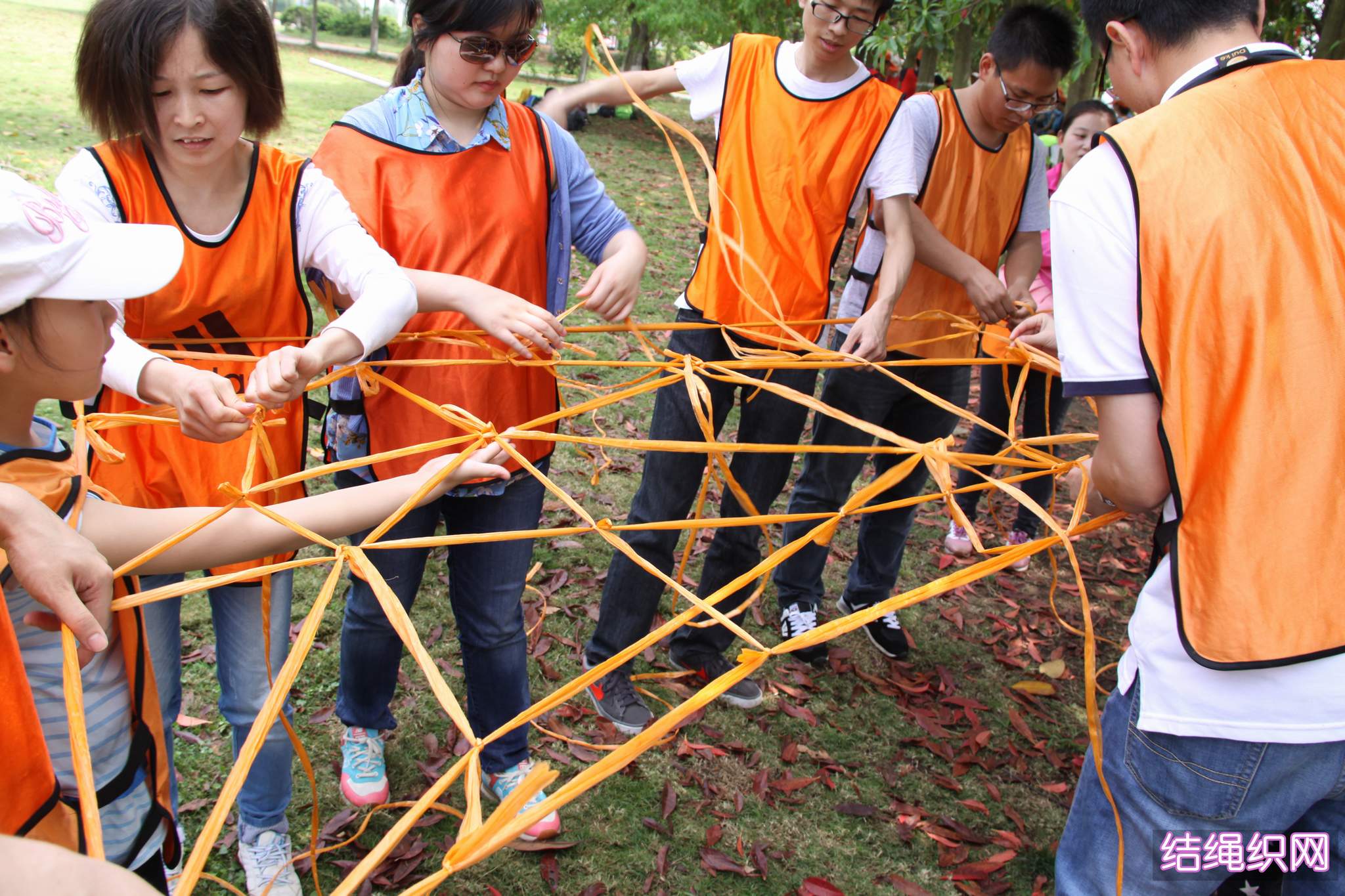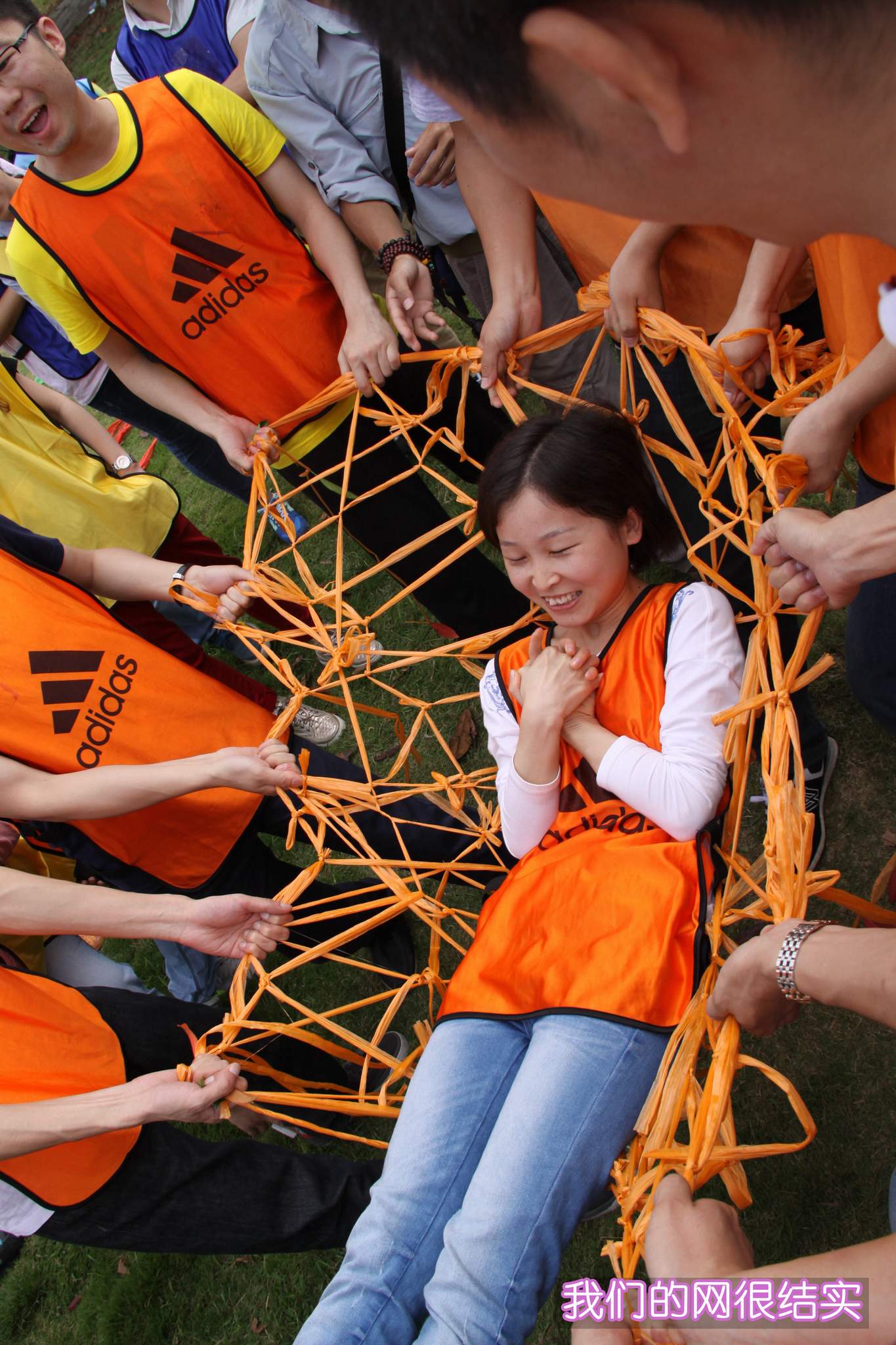 ??? 在第二個項目中,隊員們要用一捆塑料繩編織成網(wǎng),并要能承受一個人的重量。隊員們紛紛開動腦筋,一齊動手,很快便完成了任務(wù)。各支隊伍采用的編制方法不同,形狀也不同,但都能承受起一個人的重量,可以說不分伯仲。