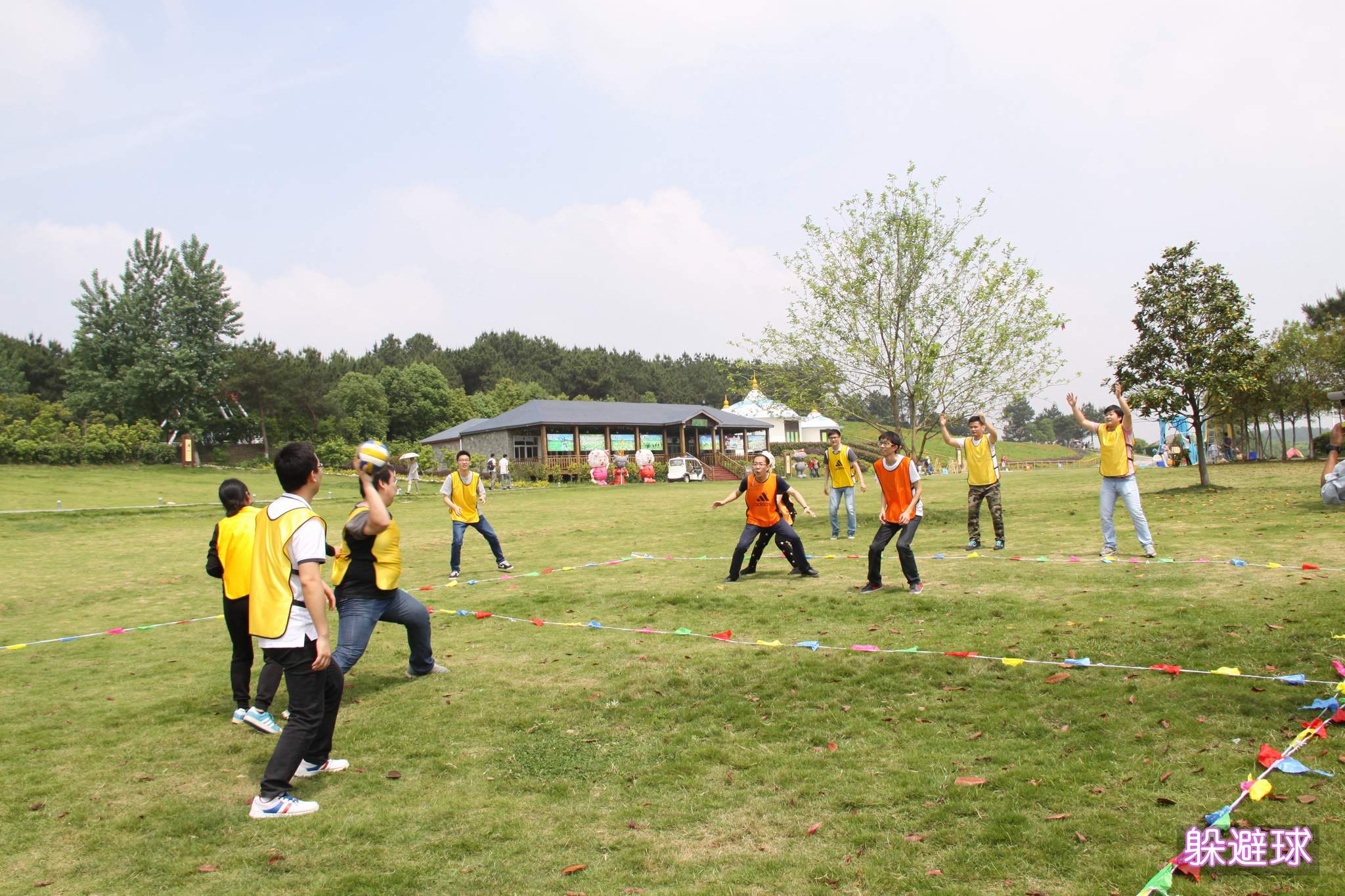 ??? 上午的最后一個項目是“躲避球”,每支隊伍選派1名女隊員和6名男隊員參賽,比賽雙方用排球向?qū)Ψ酵稊S,先擊中女隊員的一方獲勝,這個項目考驗的是隊伍的團隊精神和奉獻精神,而隊員們也都很好的完成了挑戰(zhàn)。